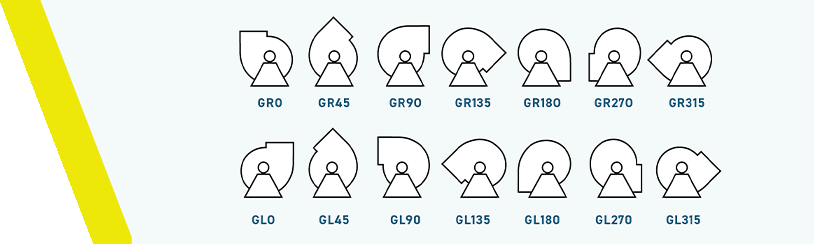 The rotation of our fans are based on Eurovent document 1/1 of 1972 (The European Committee of Air Equipment Manufacturer) and ISO 13349. The designations were to be taken when viewed along the axis of the fan on the drive side (opposite the inlet for a single inlet fan).